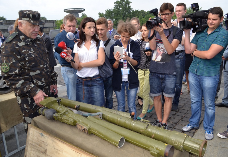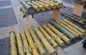 On display was also a large cache of weapons, ammunition and mines produced by Russia’s Chelyabinsk factory that were found in the Church of the Moscow Patriarchate in Sloviansk. Under the watchful eyes of Ukrainian military commanders, foreign military attaches and a rather small general public, Iryna Herashenko, the presidential envoy for the settlement of the conflict in Donetsk and Lugansk, said that “this evidence was taken to Kiev so that Ukraine and the rest of the world can see how Russia is ‘not involved’ in the conflict.”